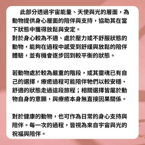 4、本網站的服務屬於能量與意識層面的療癒與溝通,旨在提供陪伴與理解,無法取代任何正規醫療或診斷。如遇動物有疾病問題請先看過醫生。