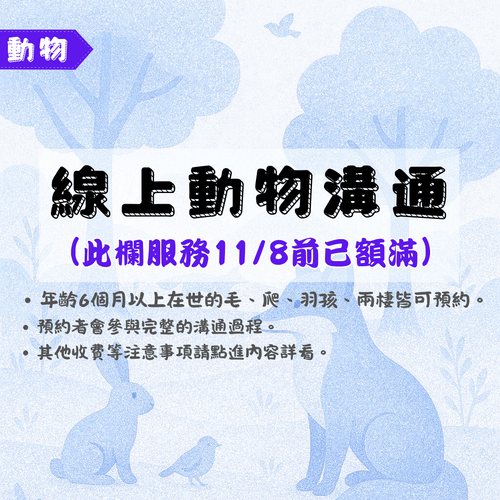 3、溝通當下不再臨時增加動物,所以要問哪些動物請在預約當下或溝通前就先行告知好。