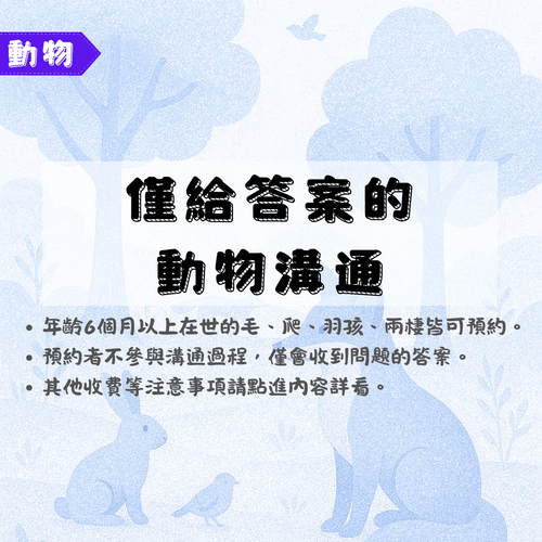 ◼︎僅於安排日的空檔時間詢問照護人所有提供的問題並回覆答案,回傳完答案後則結束服務,所以與線上溝通不同,預約者不參與整個溝通過程、不需在線上等,如是想與動物、溝通師一起同時在線上進行3方溝通者請改約「線上動物溝通」。