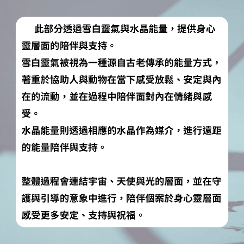 2、服務開始後,因屬於能量層面與溝通性質之個人化體驗,無法中途或事後退款,敬請理解與配合。